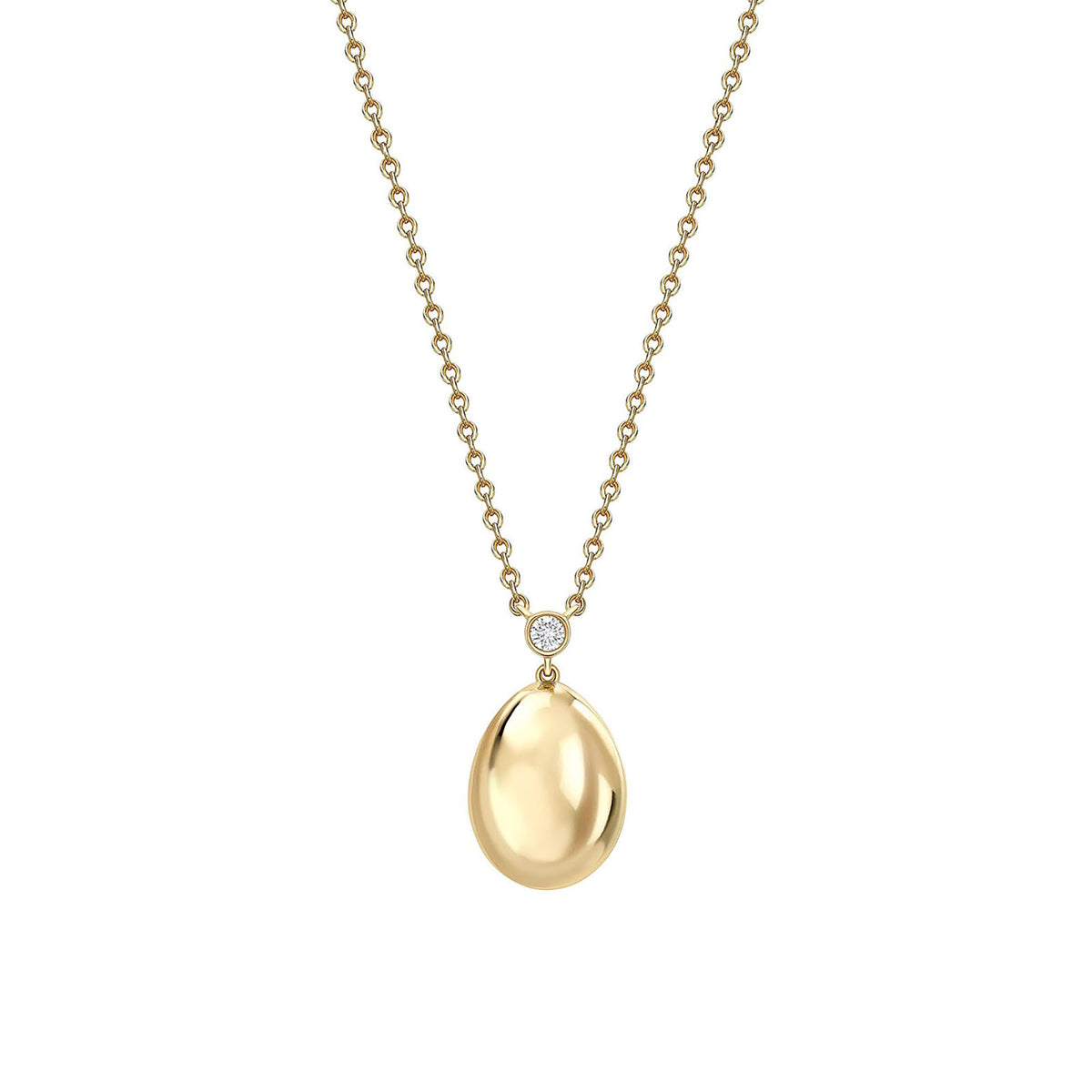 This simple Fabergé Essence Yellow Gold Petite Egg Pendant features a round white diamond, set in 18 carat yellow gold. The egg pendant is 14mm.