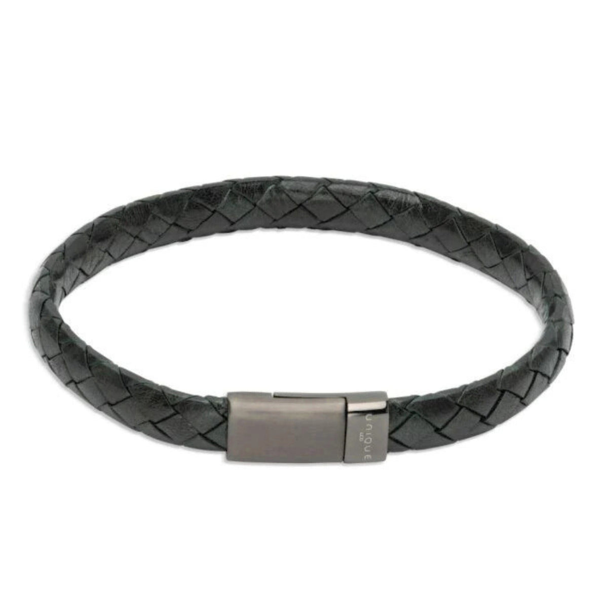 Unique & Co Green Leather Braided Bracelet with Gunmetal Grey Steel Clasp 21cm