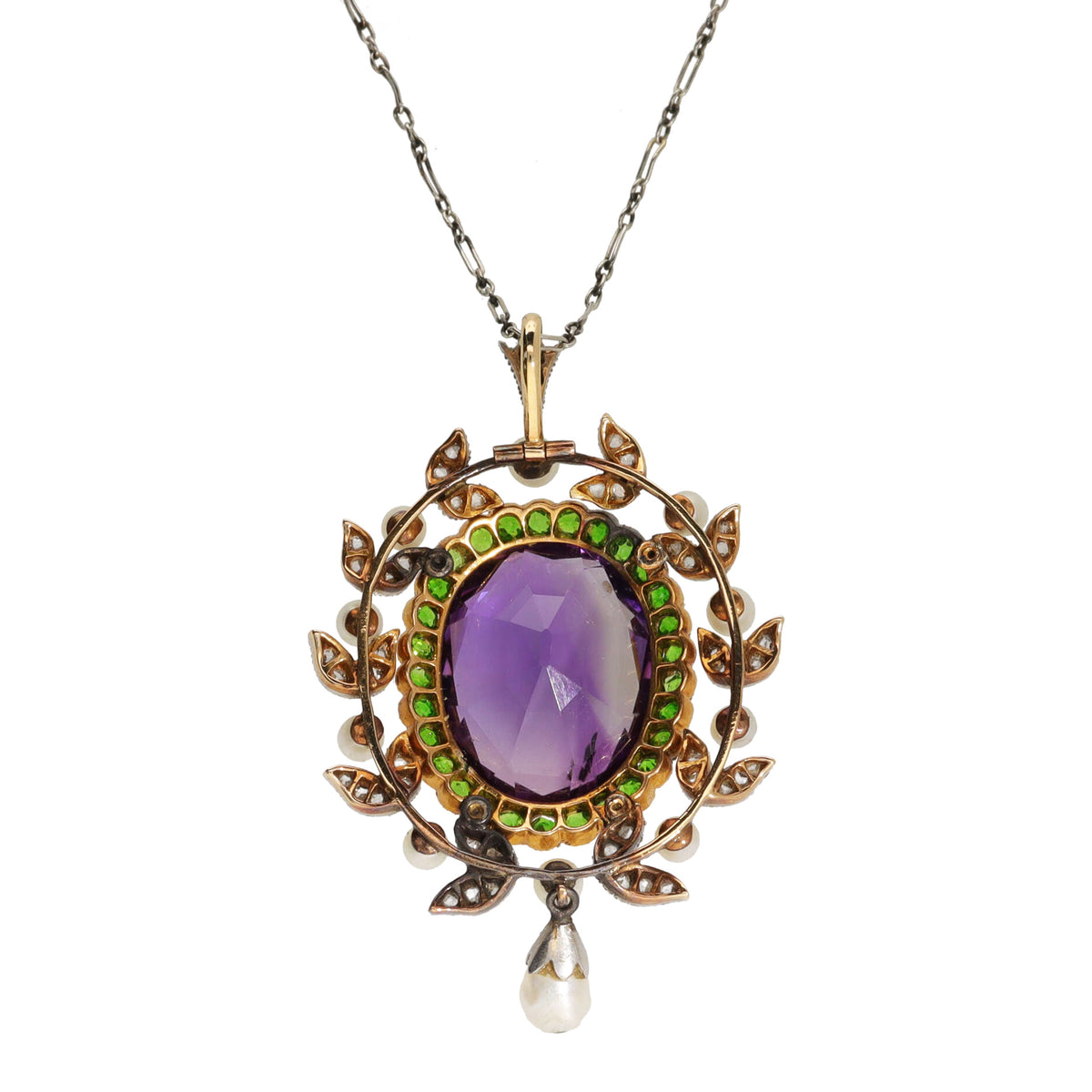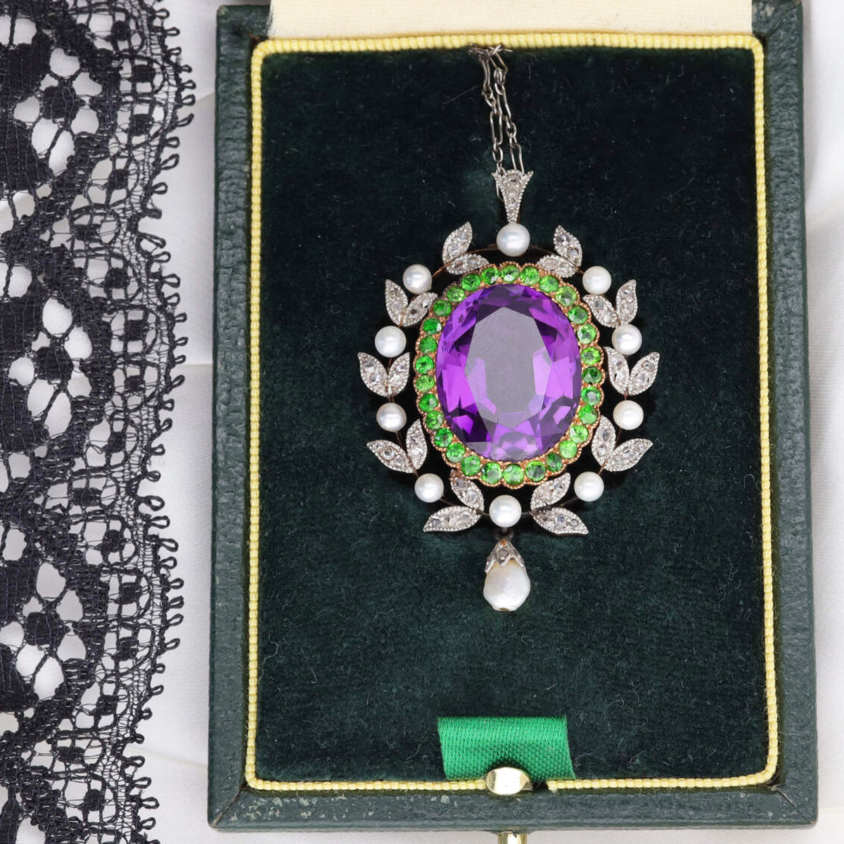 The oval amethyst forms a striking centrepiece, complemented by the vivid green garnets and the soft lustre of seed pearls, while diamonds add a refined brilliance. Beautifully balanced and full of period charm, the pendant is supplied with a short choker length 14 inch chain, ready to wear and treasure.