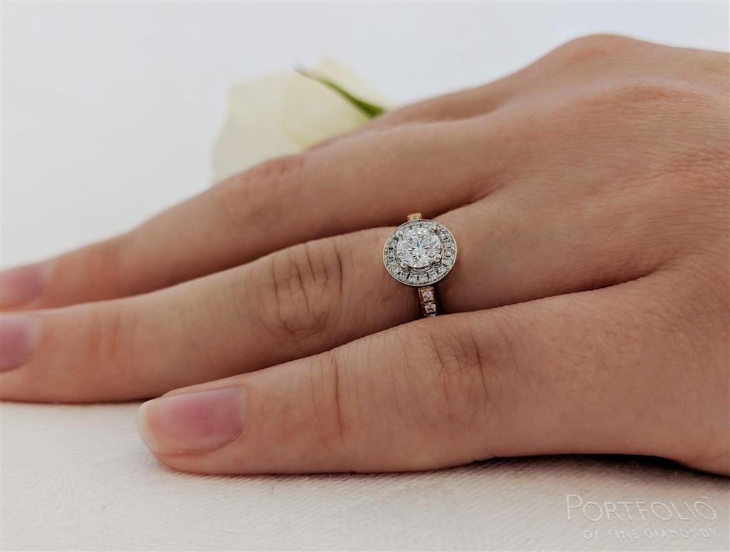 The halo of diamonds enhances the size of the certificated centre diamond, creating a mesmerising ring.