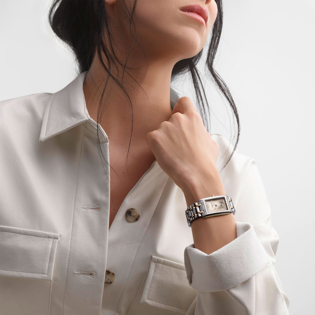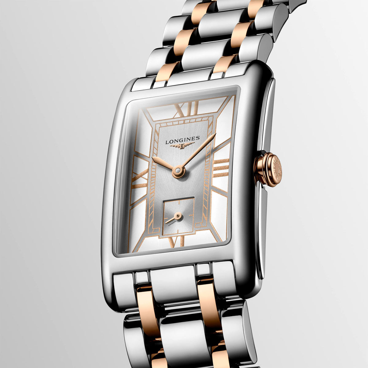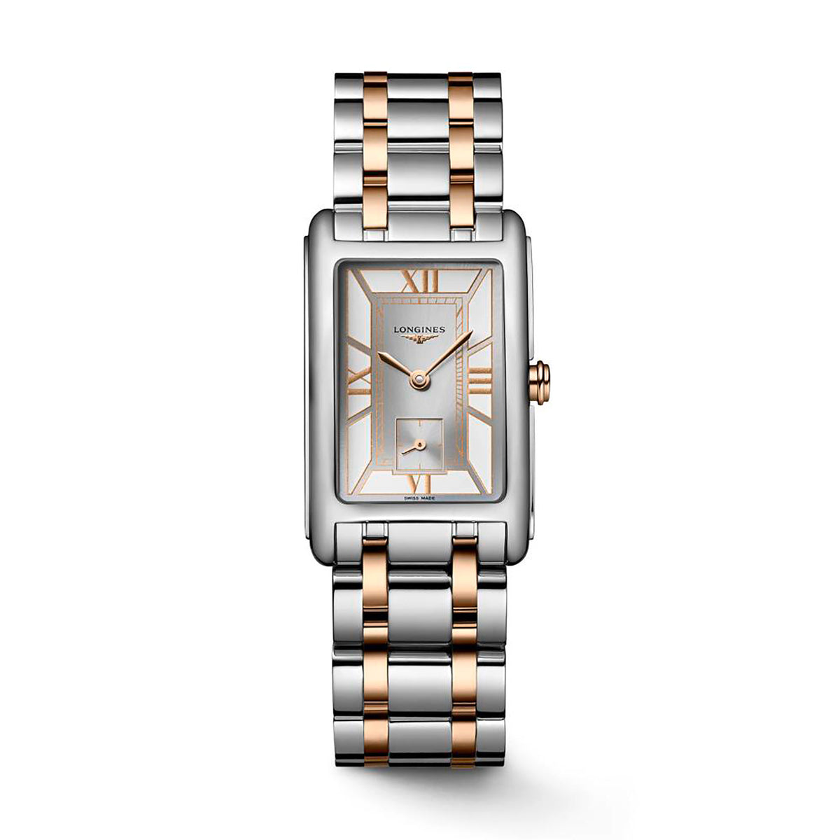 The 23.3mm x 37mm rectangular case is crafted from stainless steel and accented with an 18ct rose gold crown, adding warmth and sophistication. Its white dial is embellished with rose Roman numeral markers and hands for a cohesive style. Powered by a reliable quartz movement, this watch ensures precise timekeeping. The two-tone bracelet, crafted from stainless steel and 18ct rose gold, completes the look, making the L5.512.5.75.7 a stunning choice for those who appreciate timeless elegance with a modern twist in the LONGINES DOLCEVITA COLLECTION.