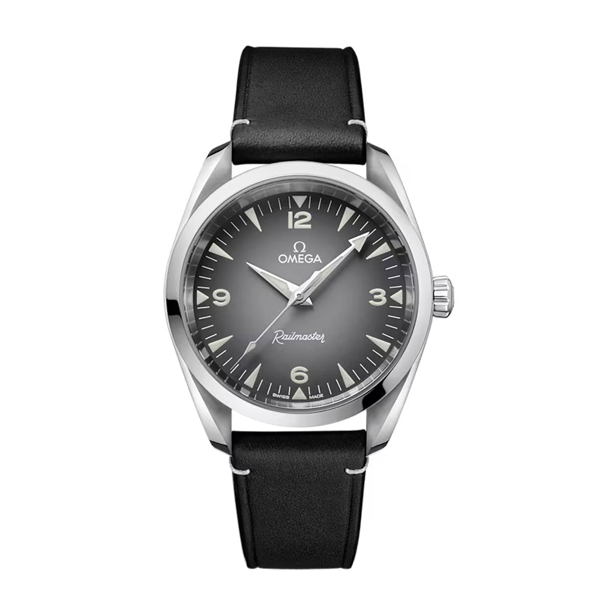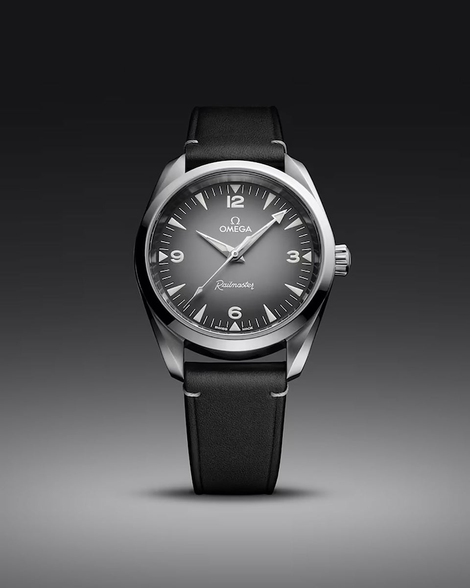 The original OMEGA Railmaster was launched in 1957 for professionals working on the railways. For this modern update, OMEGA has retained that same timeless look while updating the design with a new colour and a modern standard of precision. The symmetrical 38 mm case is brushed and polished, and is presented on a black leather strap. In keeping with the original Railmaster’s easy-to-read display, the dial of this model is grey with a black gradient, and features large numerals and hour markers in white Super-LumiNova. This watch continues the Railmaster’s legacy of anti-magnetism, courtesy of the Co-Axial Master Chronometer Calibre 8806. The movement is resistant to magnetism up to 15,000 gauss, and can be viewed through the transparent sapphire crystal on the caseback. Movement Calibre OMEGA 8806 Self-winding movement with a Co-Axial escapement. Certified Master Chronometer, approved by METAS, resistant to magnetic fields reaching 15,000 gauss. Free sprung-balance with silicon balance spring, automatic winding in both directions. Special luxury finish with rhodium-plated rotor and bridges with Geneva waves in arabesque.