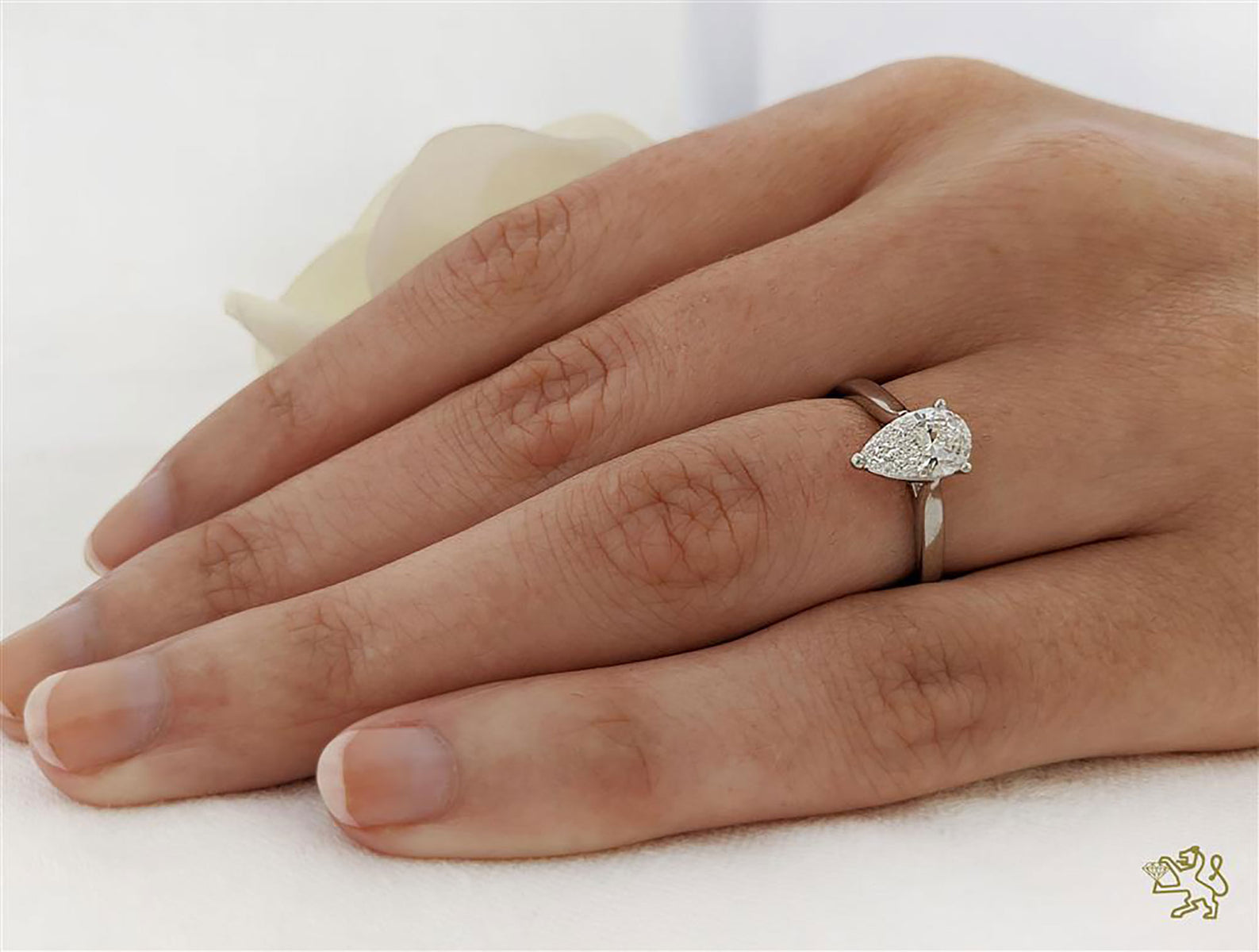 Platinum Solitaire Pear cut diamond engagement ring in a 3 claw setting, set in platinum.