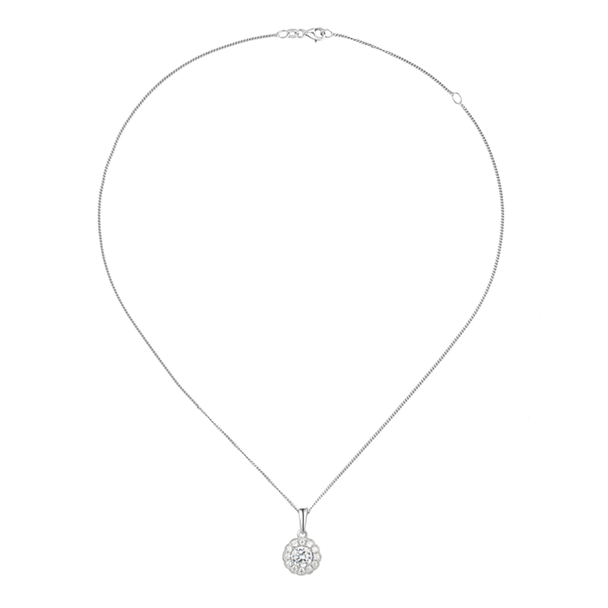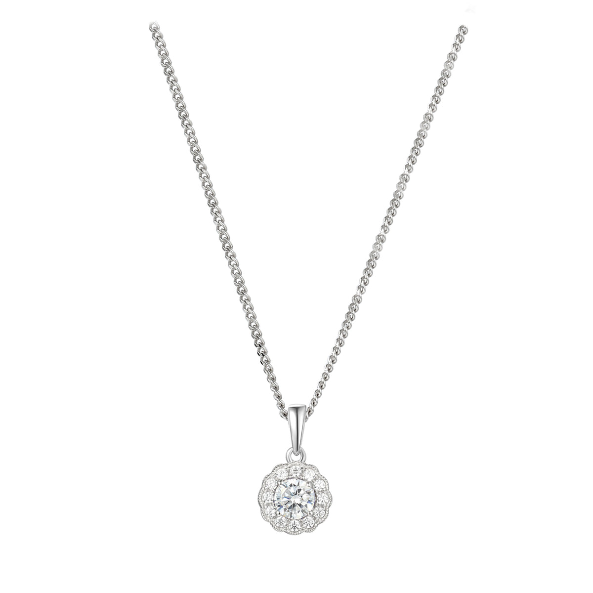 Comes with a 16" to 18" adjustable silver chain. The Amore in-house design team have created a sparkling necklace from times gone by, so why not get your dose of vintage Hollywood Glamour – just what you need for a glitzy occasion but also perfect for everyday wear. Match the necklace with the fabulous ring and earrings. The necklace is 13mm long including the loop and has a 7.5mm diameter cluster head with a 4mm round cubic zirconia surrounded by 12 small cubics with a mill grain finish.