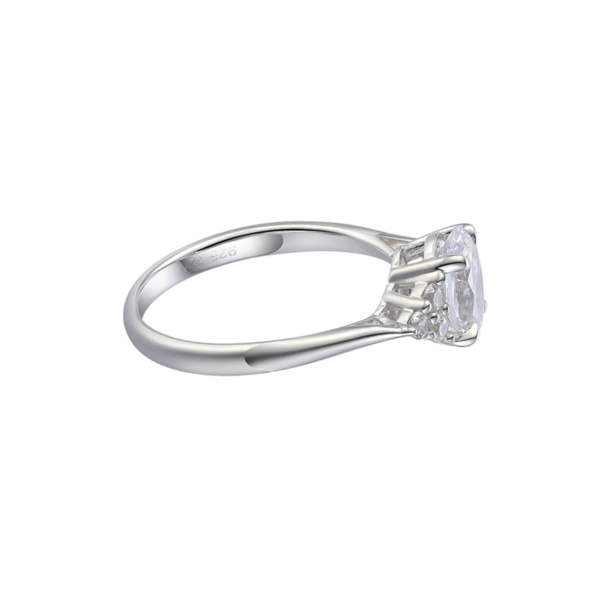 Captivating ring containing a beautiful oval cubic zirconia and enhanced with 3 round cubics either side in a triangular formation. Cubic zirconia replicates the look of diamond, it is strong, durable, looks great, and is high quality, adding sparkle and shine to any design.