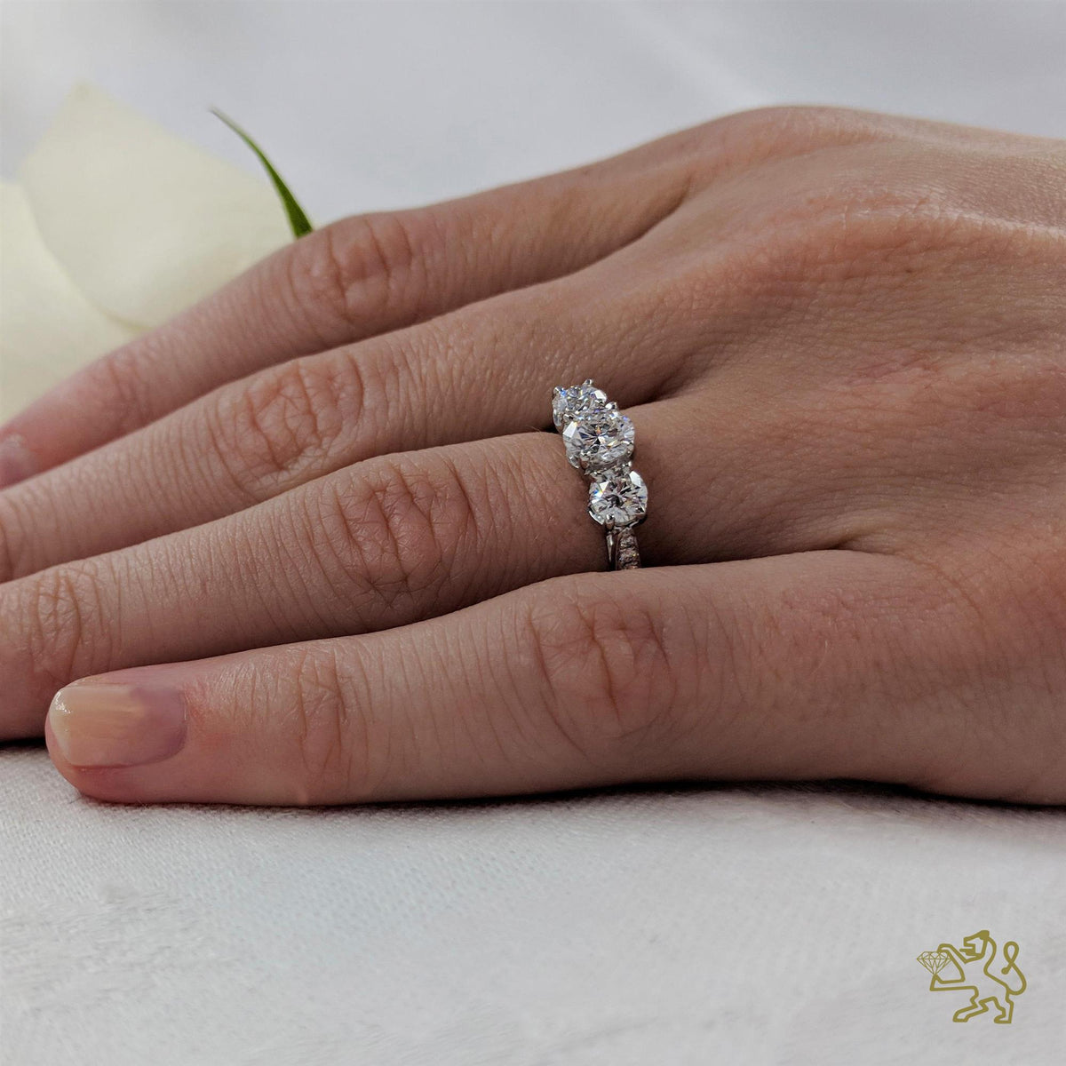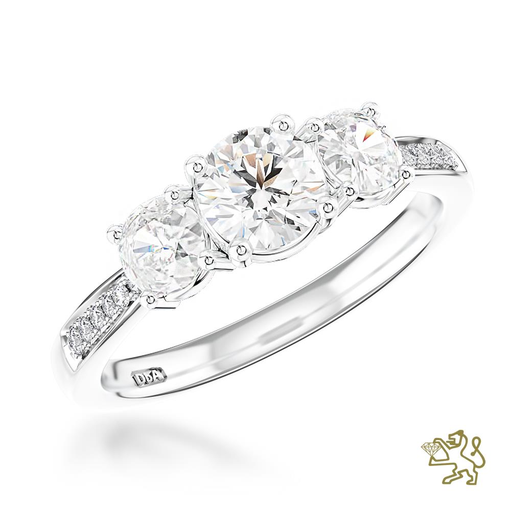 Platinum Three Stone Micro-set diamond shoulders combined with three matching stones perfectly blend the grandeur and brilliance of diamonds to create a wonderfully unique ring.