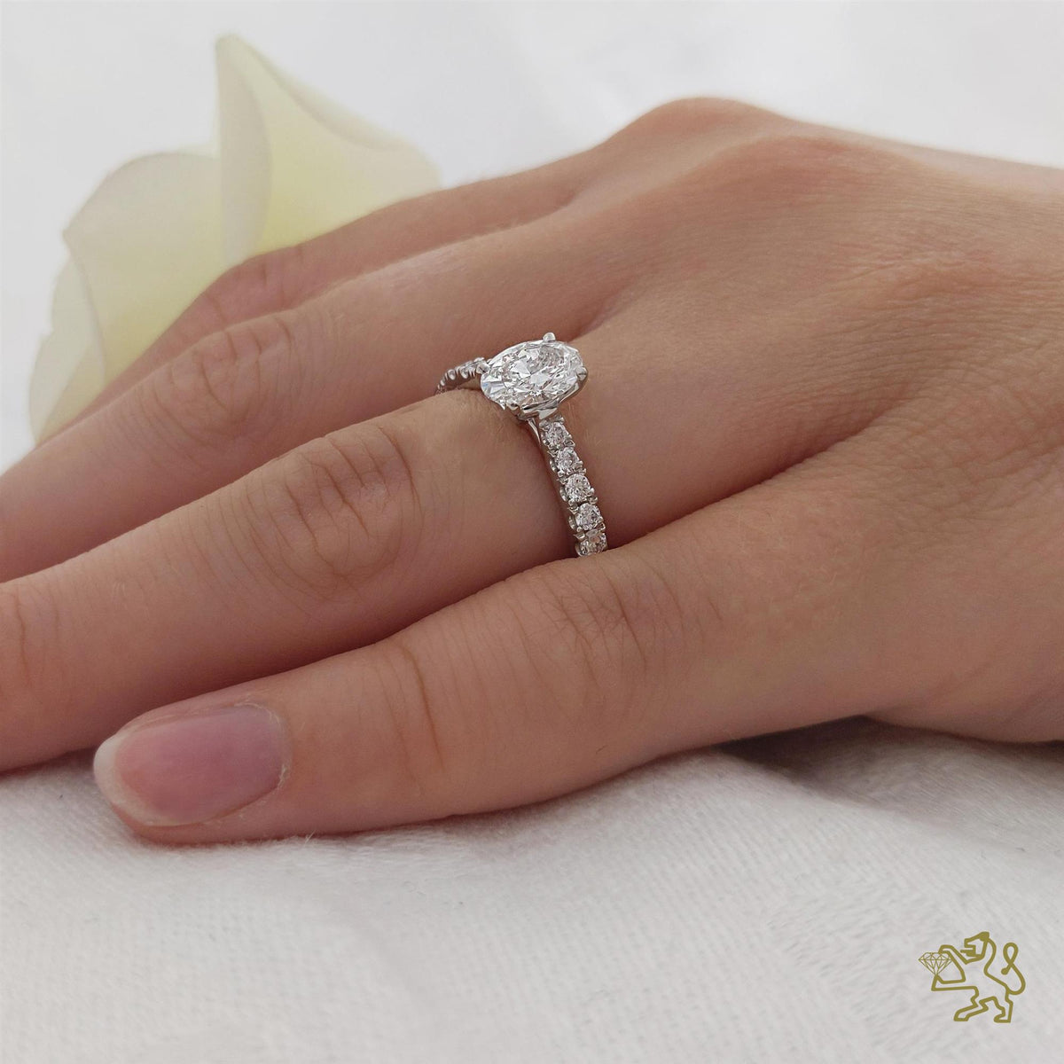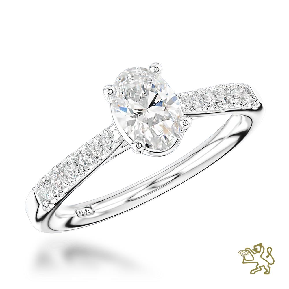 Platinum Solitaire Oval cut diamond engagement ring with scalloped set diamond shoulders. In a 4 claw setting all in platinum