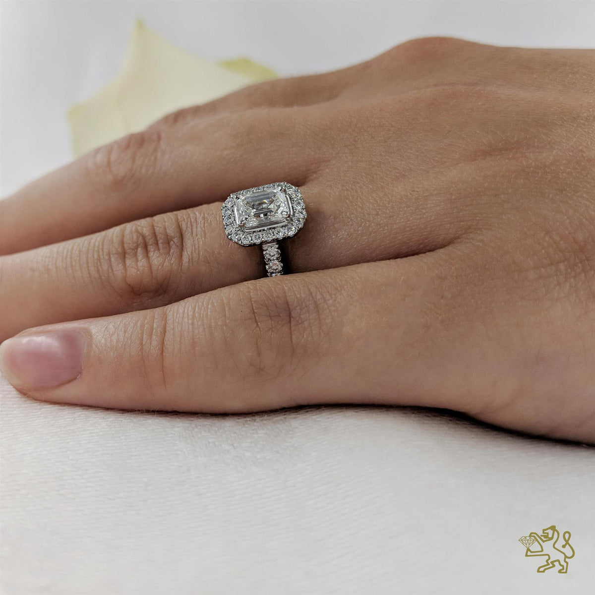 The halo of diamonds enhances the size of the certificated centre diamond, creating a truely mesmerising ring.
