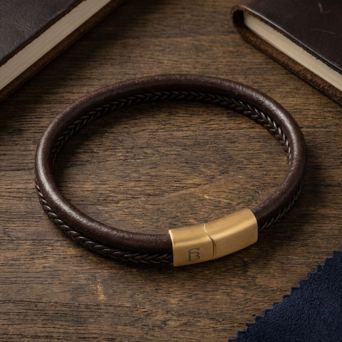 Steel and Barnett Grady Duel Strand Brown Leather Men's Bracelet with a Plated 18ct Gold Clasp - Medium