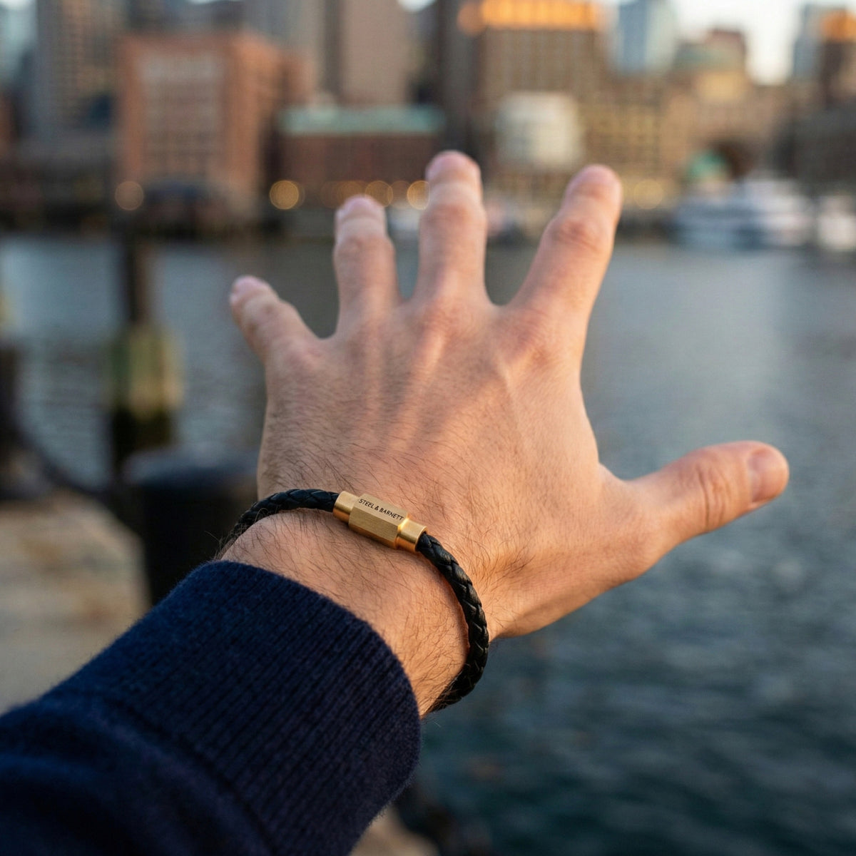 Steel and Barnett Luke Landon Thin Braided Black Leather Men's Bracelet with a Plated 18ct Yellow Clasp - Medium