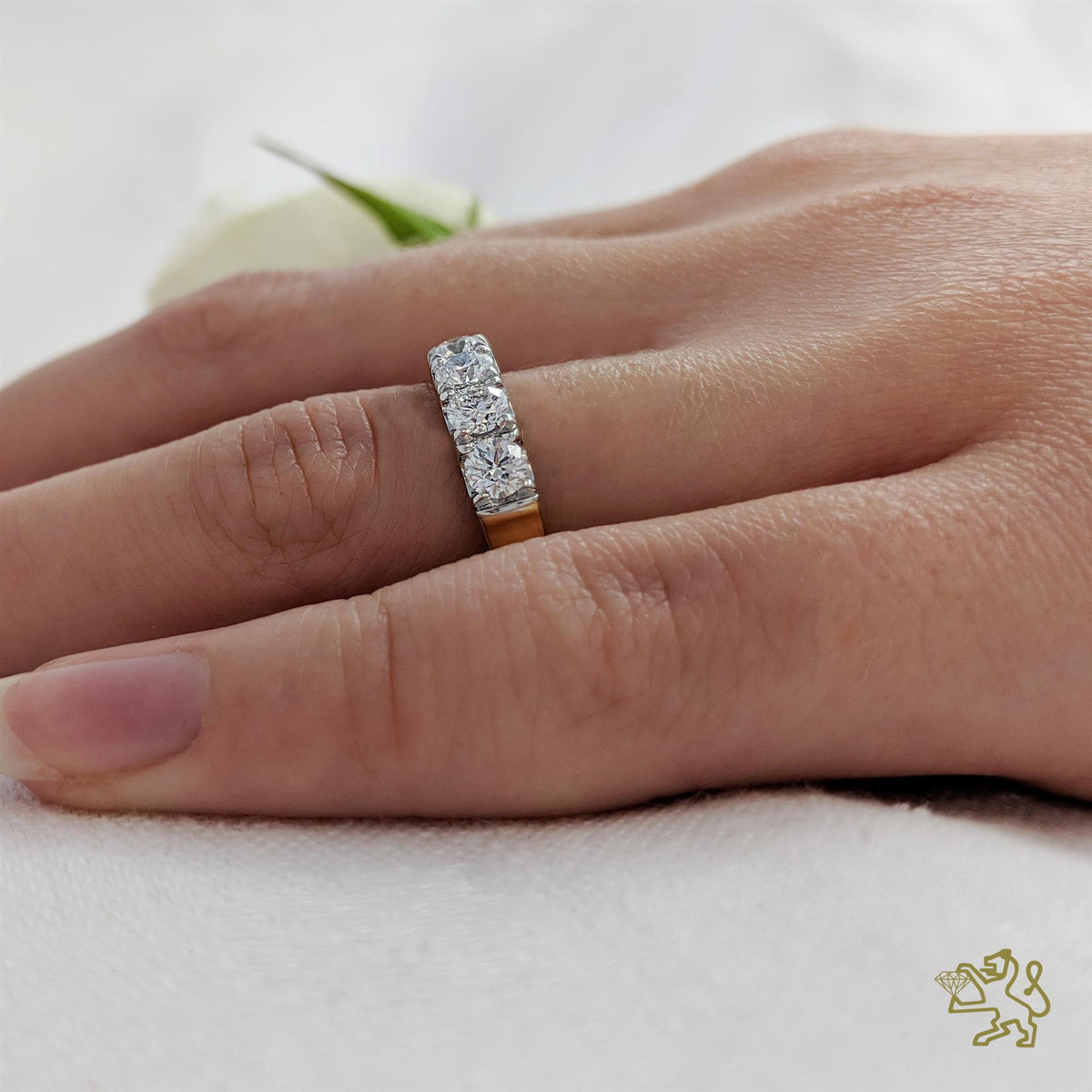 The 6 diamonds are set in platinum on an 18ct gold band using a mix of traditional and cutting-edge techniques. While the platinum enhances the brilliance of the diamonds, the hand-finishing of our rings allows every surface to be polished to a mirror finish, and the microscope-assisted stone setting means each diamond is set perfectly and securely.