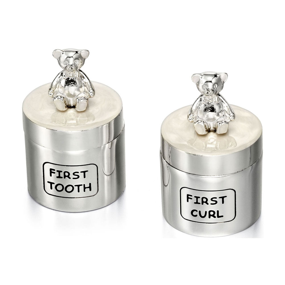 Celebrate those special moments with this beautiful silver plated tooth box and curl box.