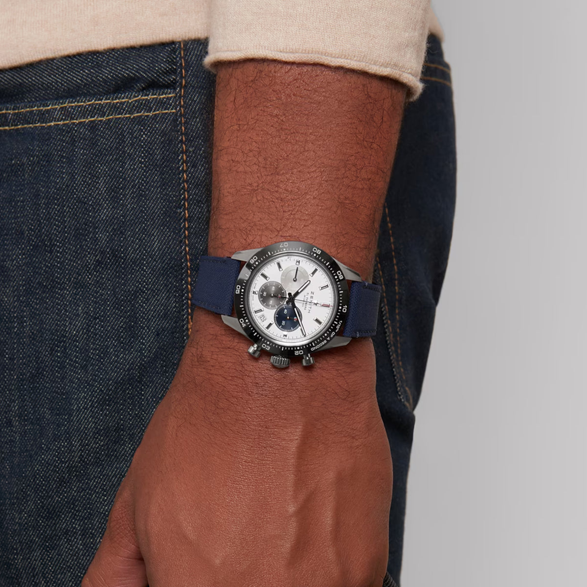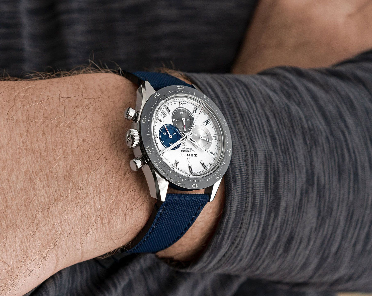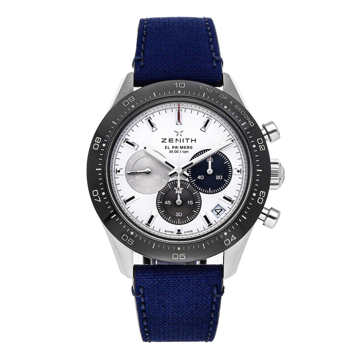The CHRONOMASTER Sport combines elements of past ZENITH chronograph references such as the tri-colour dial, pump-style pushers and steel bracelet with a black ceramic bezel, all in a modern 41mm case. This version features a white dial paired with a blue rubber strap. Powered by the El Primero 3600 1/10th of a second automatic chronograph movement.