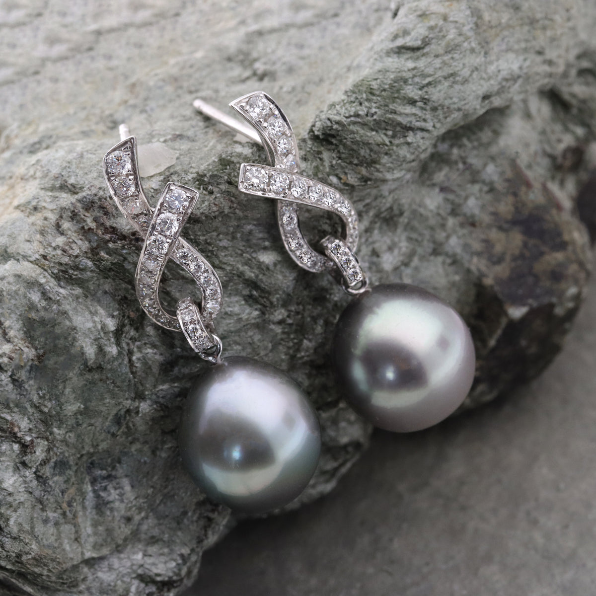 Drop earrings featuring a single 11 x 11.5mm Tahitian cultured pearl and 0.56ct round cut diamonds in a twist design, set in 18ct white gold. Tahitian black pearls are renowned for their large size, high luster, and unique dark colors. Often referred to as black pearls, their colour ranges from charcoal, silver, and peacock green to purple with an oil-slick effect.