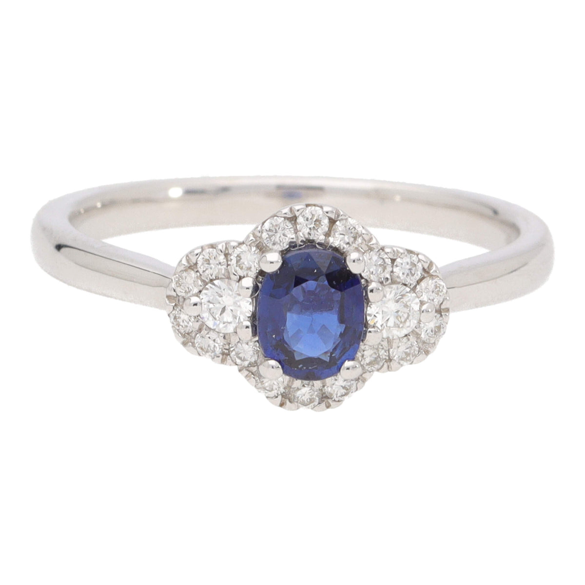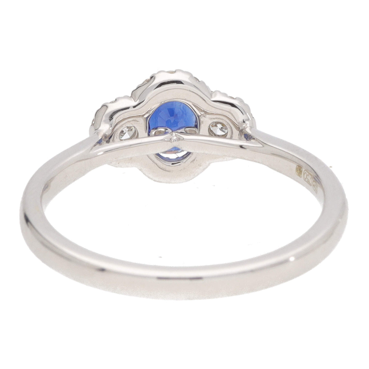 A stunning ring showcasing a central oval sapphire of 0.42ct, flanked by two sparkling diamonds and surrounded by a halo of diamonds totalling 0.22ct.