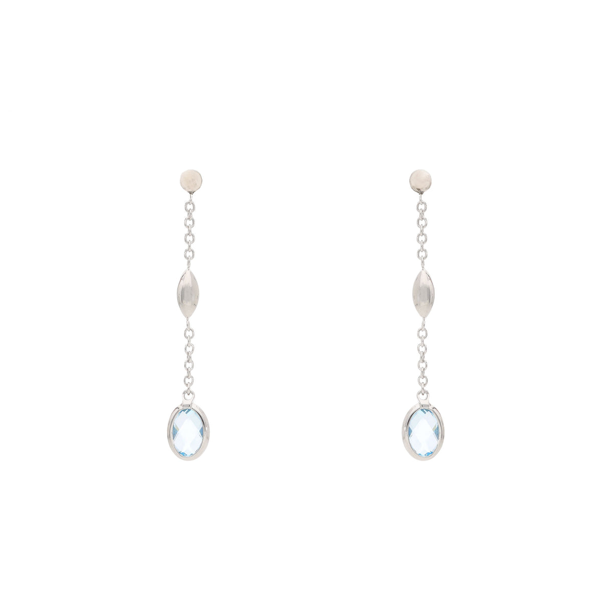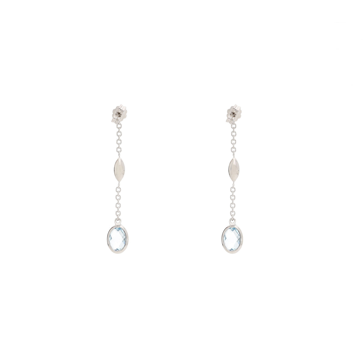 These graceful drop earrings feature facetted oval blue topaz stones and marquise shaped beads, set in 9ct white gold. 40mm drop. Post and butterfly fitting.