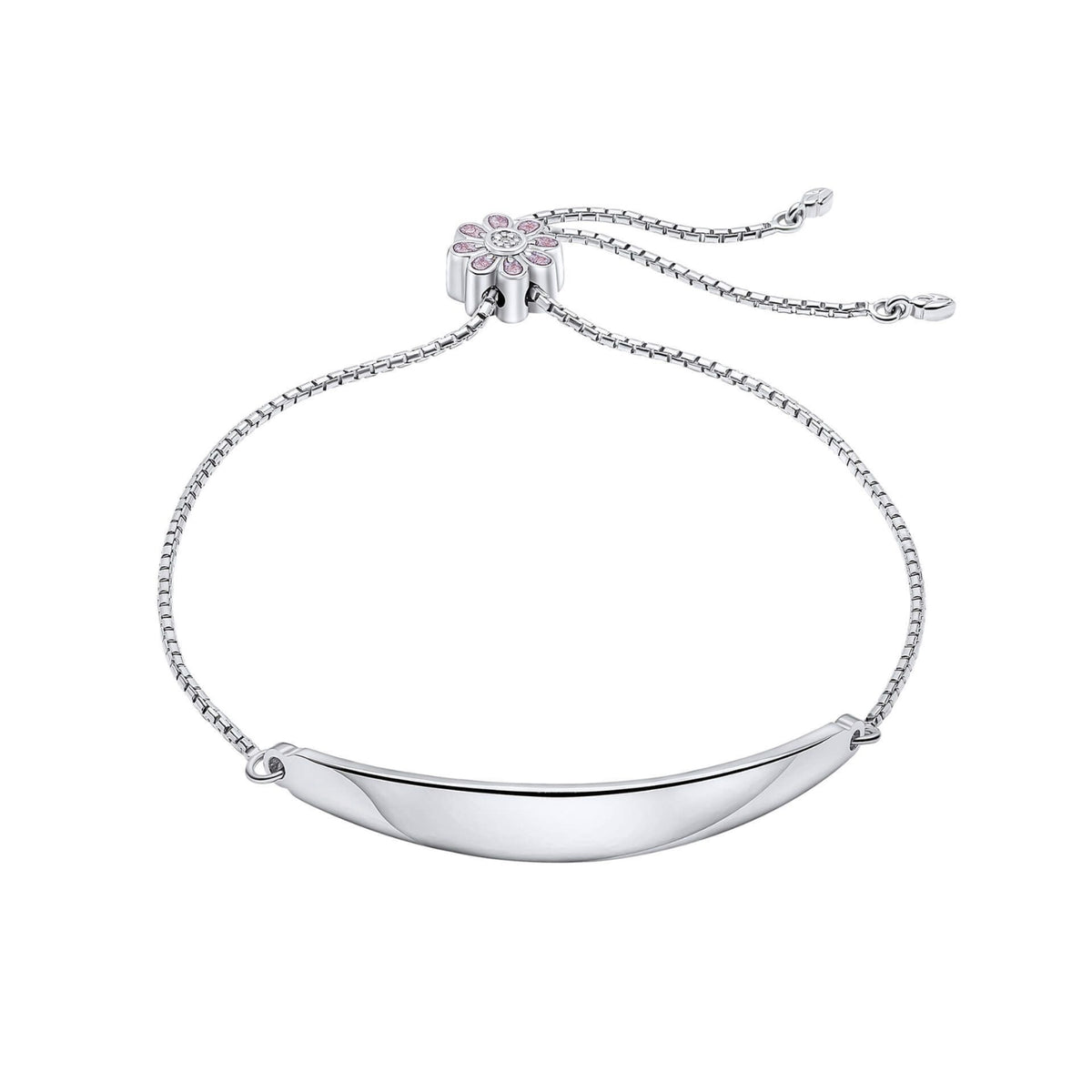 Step into the whimsical world of childhood with this toggle bracelet, a delightful addition to any child’s jewellery collection. Crafted with care from recycled sterling silver and finished with a platinum plating, this toggle bracelet showcases a charming pink enamel flower motif, serving as the toggle clasp, with a radiant diamond nestled at its heart. But there's more to this bracelet than meets the eye. Add a touch of sentimentality by inscribing a name, date, or even a cherished message onto the sleek bar, making each bracelet a truly unique keepsake. This toggle bracelet exudes timeless charm and playful sophistication. It's a perfect accessory for expressing individual style and igniting the spark of wonder and creativity in every child.