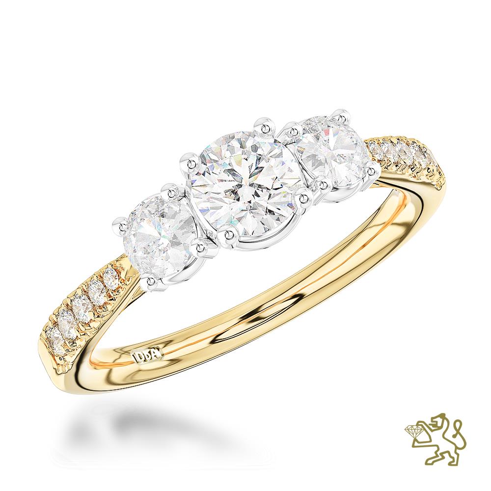 18ct Yellow Gold Shank and Platinum Head Three Stone Micro-set diamond shoulders combined with three matching stones perfectly blend the grandeur and brilliance of diamonds to create a wonderfully unique ring.
