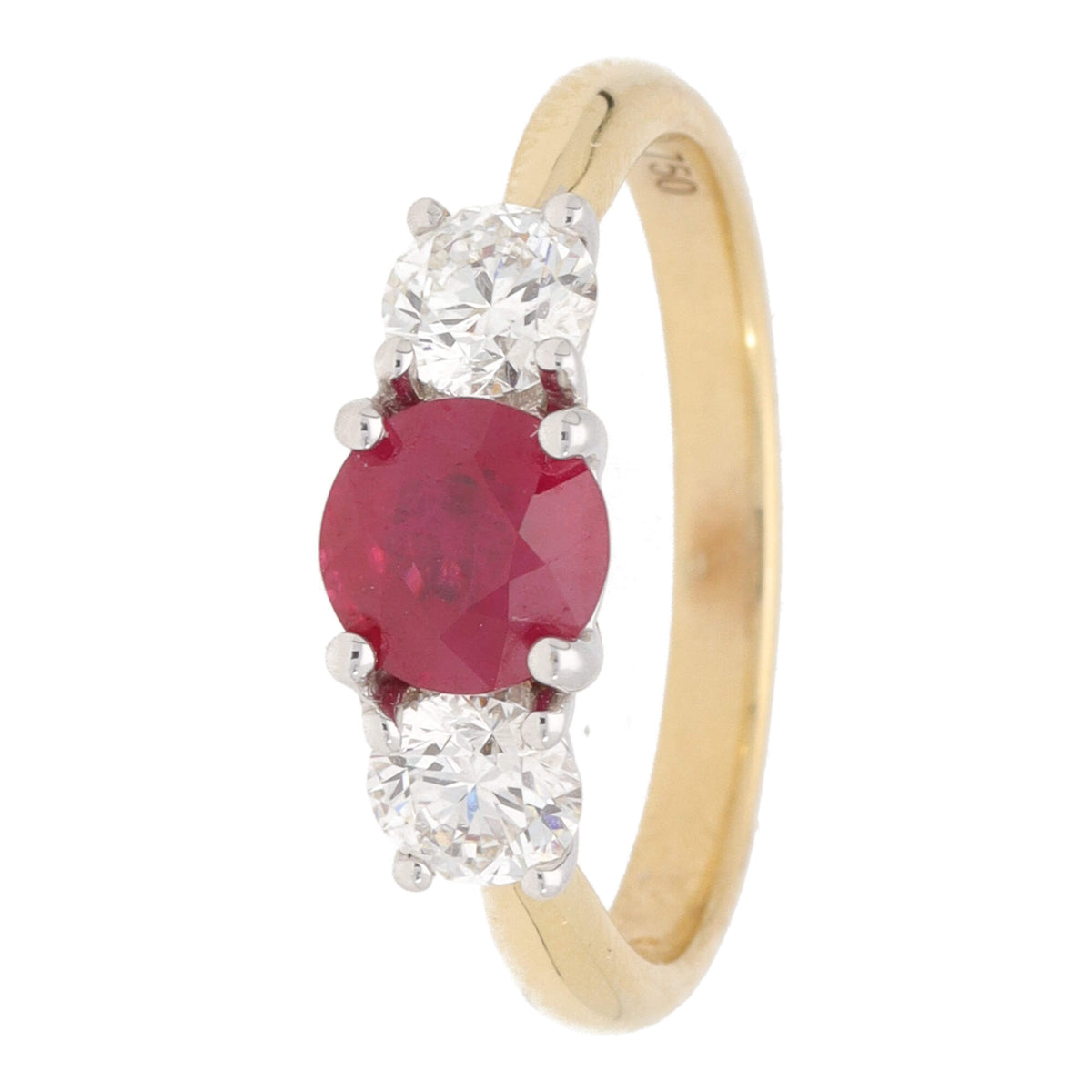 A striking ring featuring a central 1.06ct ruby, flanked by two brilliant diamonds totalling 0.65ct (G VS2), all set in 18ct yellow gold.