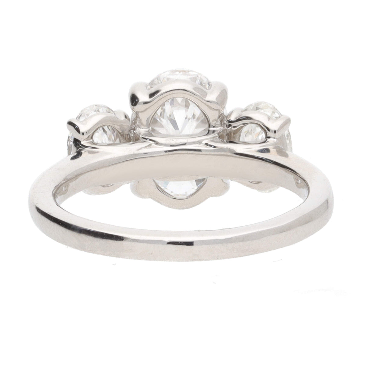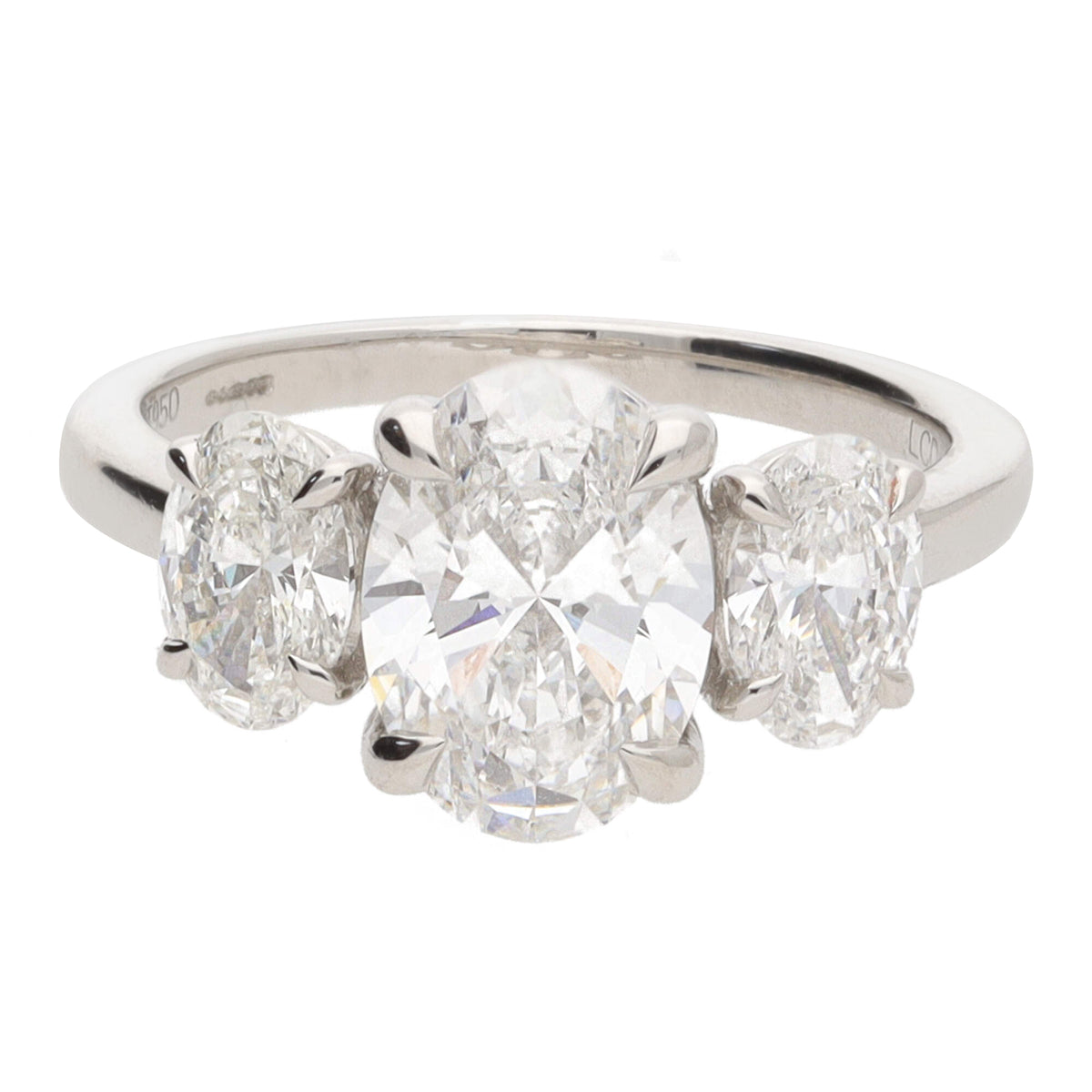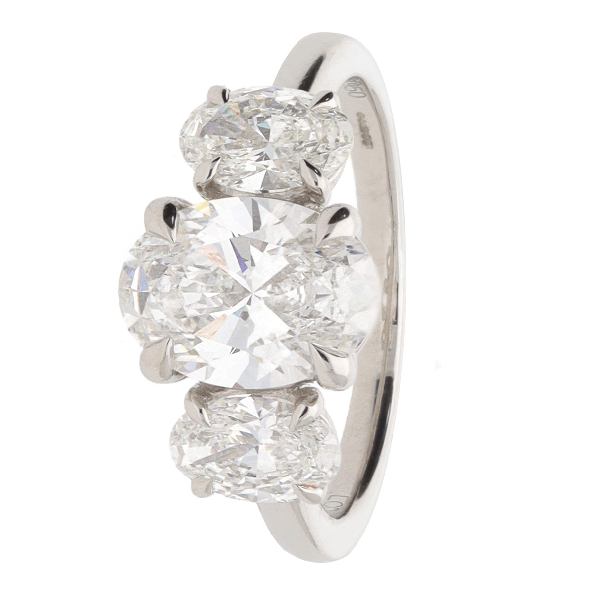 Striking yet elegantly balanced, this platinum ring is set with three perfectly proportioned oval-cut laboratory-grown diamonds, with a total combined weight of 3.00 carats. The elongated oval shapes enhance brilliance and create a flattering, finger-lengthening silhouette, while the platinum setting adds a sleek, luxurious finish.