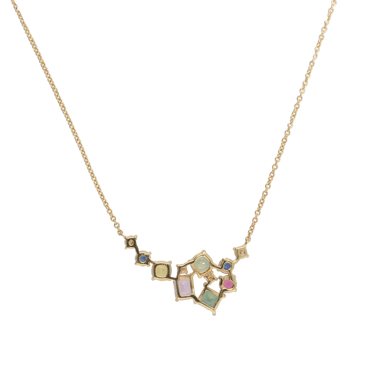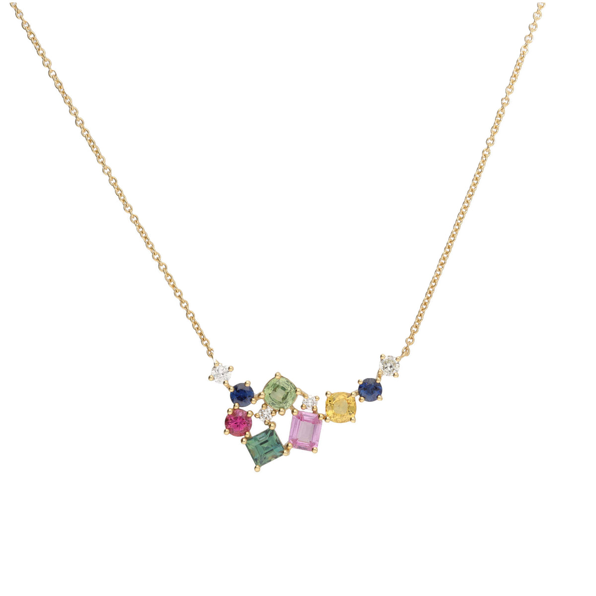This unique necklace features an asymmetric cluster of multicoloured sapphires (2.35ct) and 0.16ct diamonds in various shapes, claw set in 18ct yellow gold.