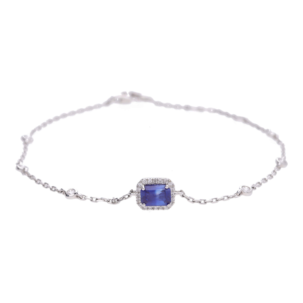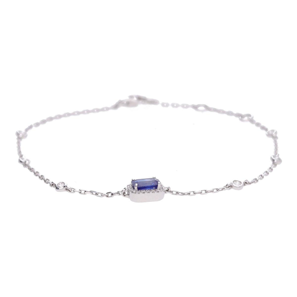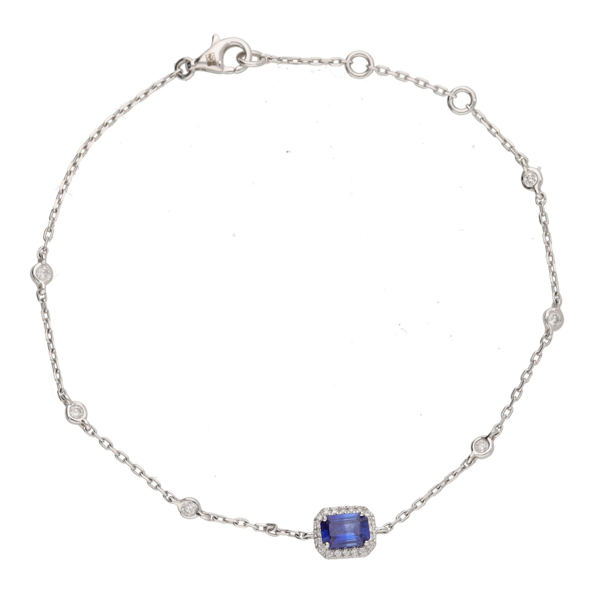 This elegant bracelet is crafted in 18ct white gold and features a stunning rectangular blue sapphire, beautifully surrounded by a diamond-set halo. The design is further enhanced by six station links, adding extra brilliance and sparkle. A refined and sophisticated piece, perfect for adding a touch of luxury to any jewellery collection.