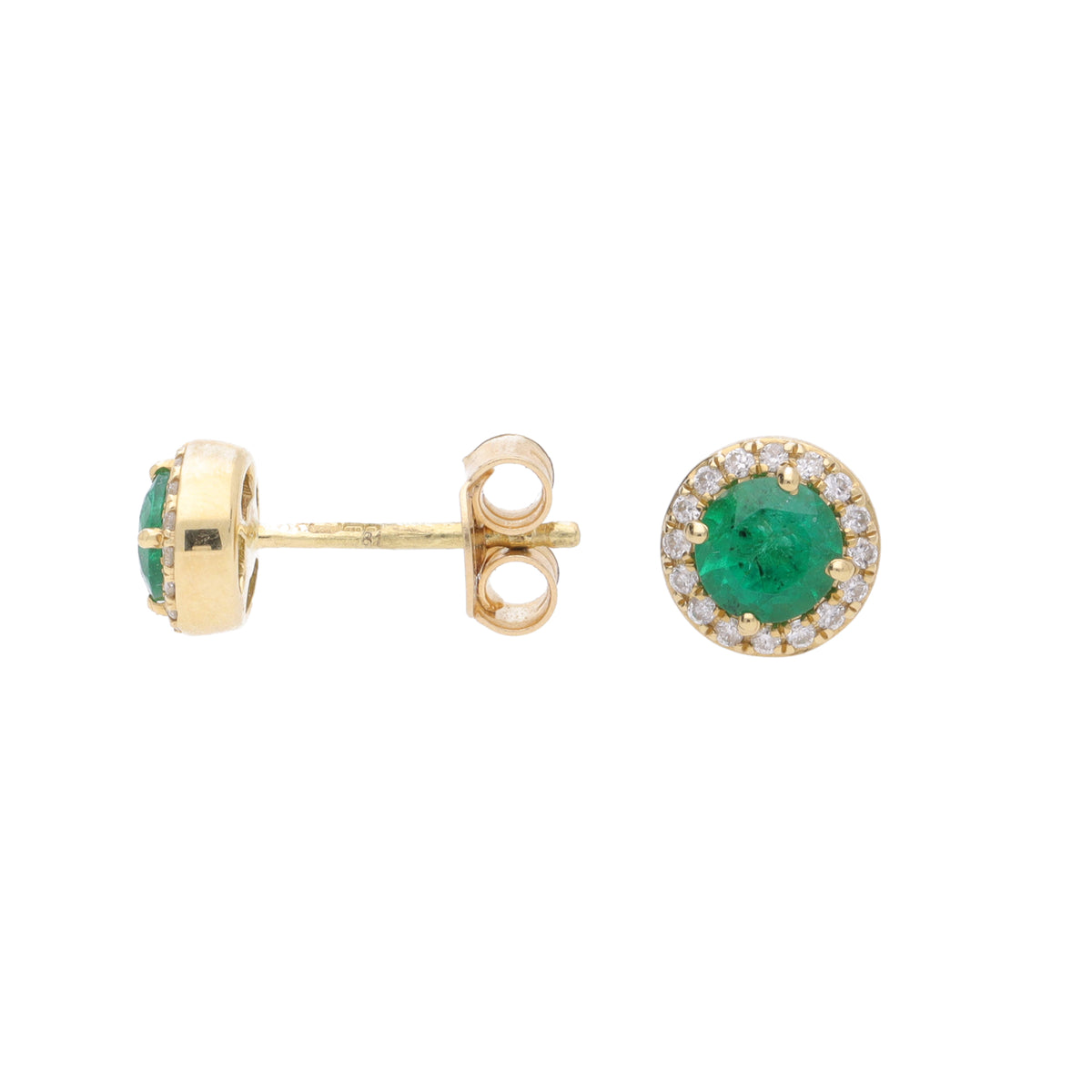 These elegant stud earrings feature a vibrant emerald (0.57ct) at the centre, beautifully framed by sparkling brilliant-cut diamonds (0.09ct) and crafted in 18ct yellow gold. A timeless design that adds a touch of colour and sophistication, these emerald and diamond earrings are perfect for special occasions or as a luxurious gift.