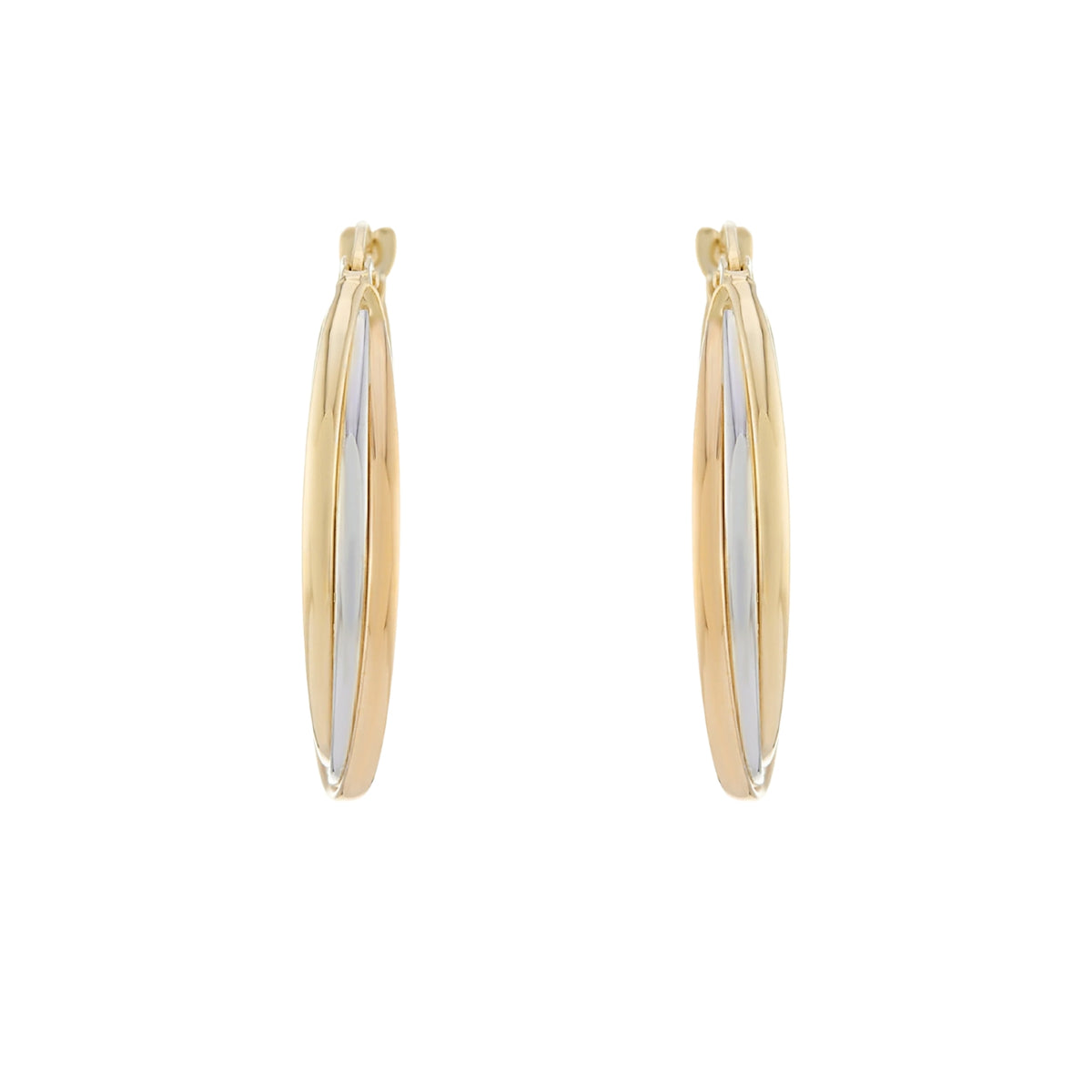 Triple strand hoop earrings in 9ct yellow, white and rose gold with a hinged fitting. Approximate width: 20mm.
