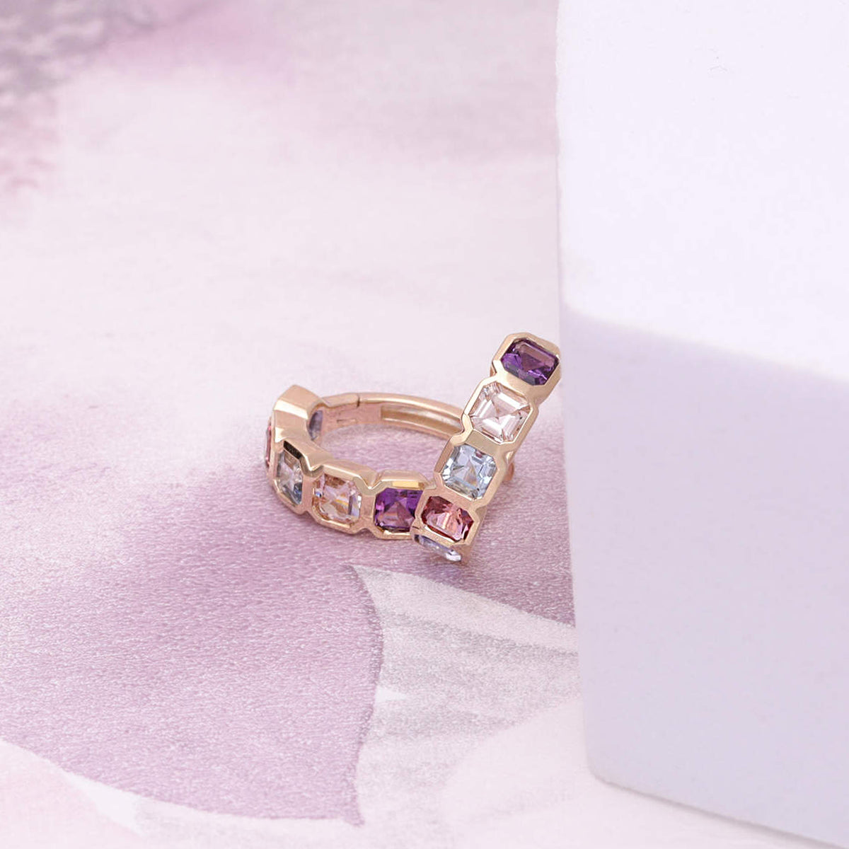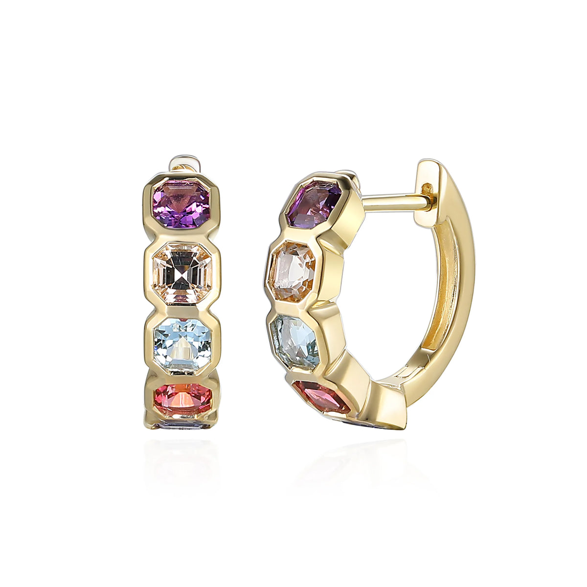 These stunning multi-step cut hoop earrings feature a vibrant mix of amethyst, morganite, aquamarine, pink tourmaline, and tanzanite, set in 9ct yellow gold for a luxurious finish.