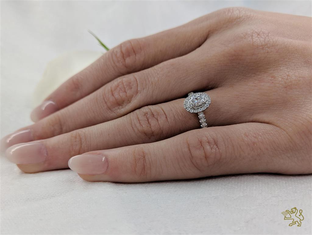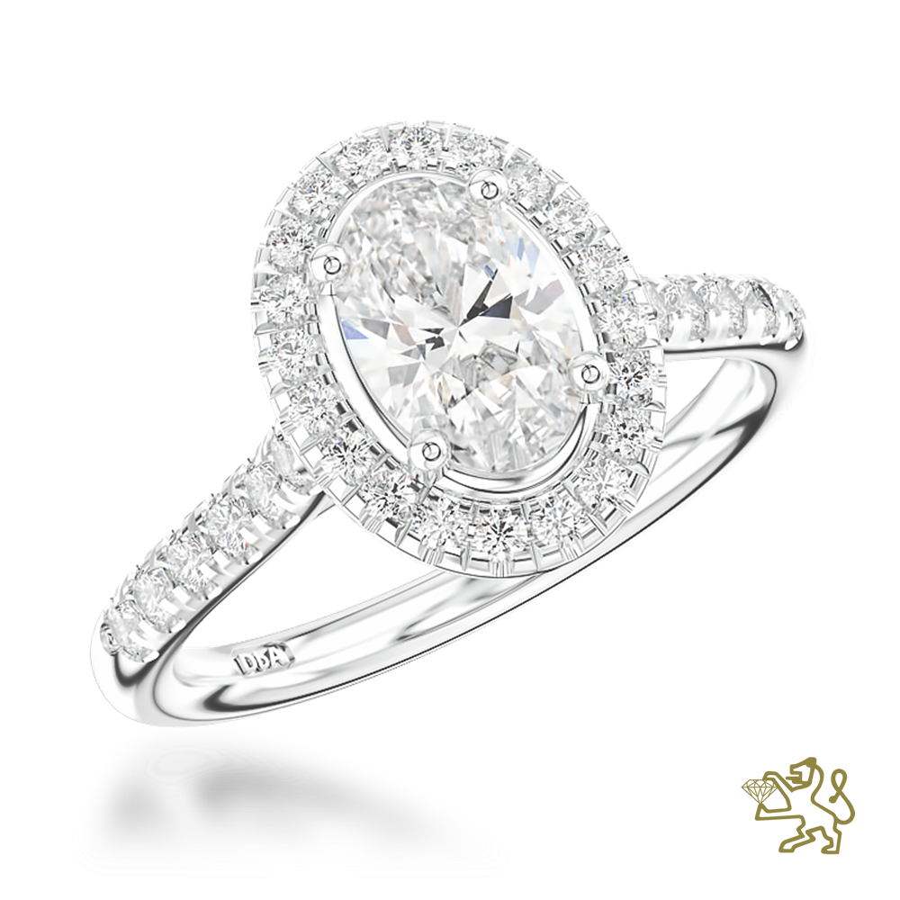 The halo of diamonds enhances the size of the certificated centre diamond, creating a mesmerising ring.