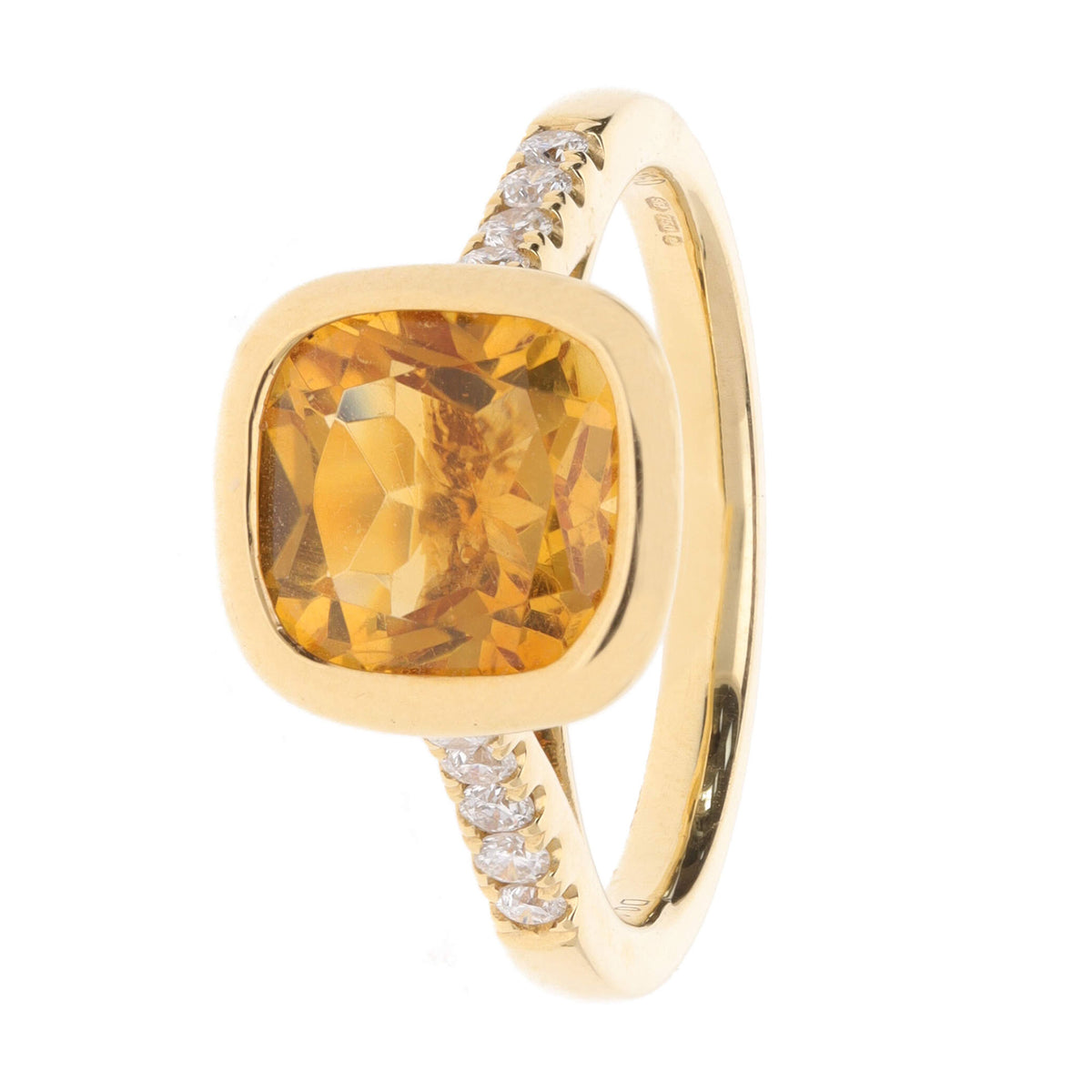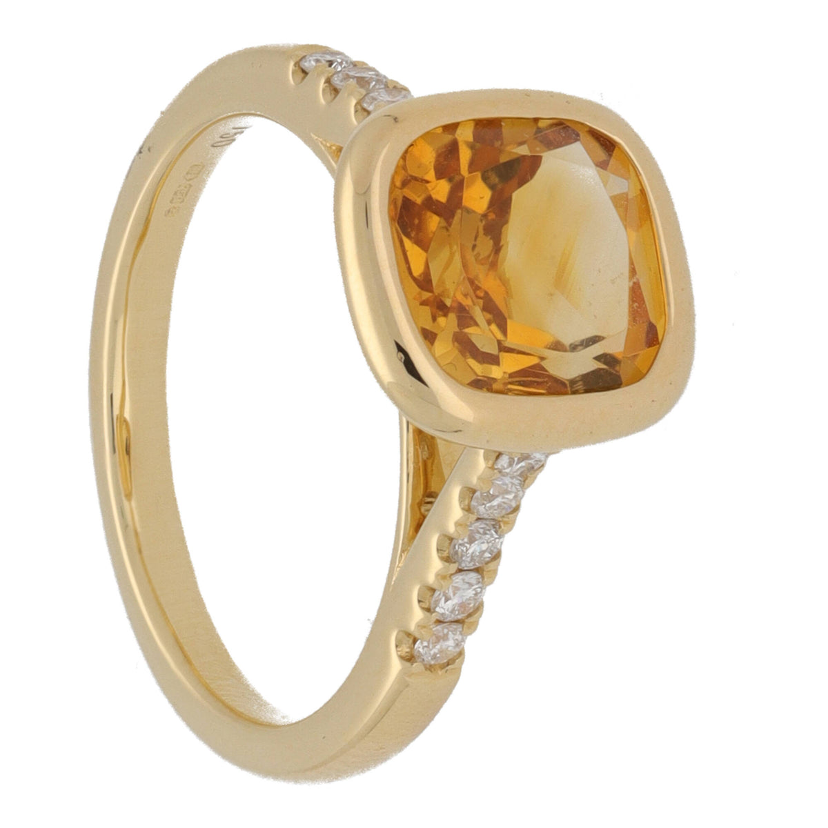 This dazzling ring features a cushion shape faceted citrine supported by diamond set shoulders. Set in 18ct yellow gold.