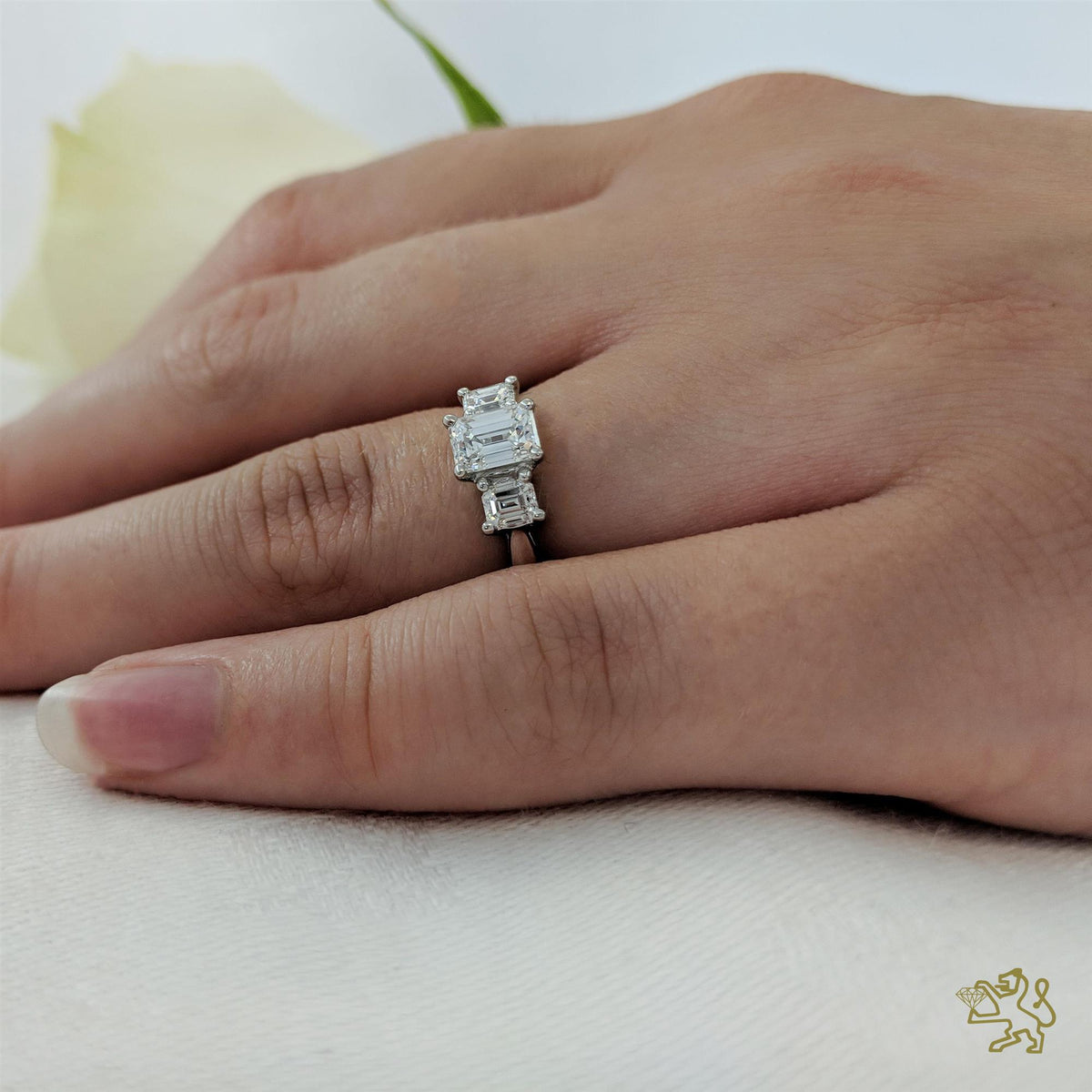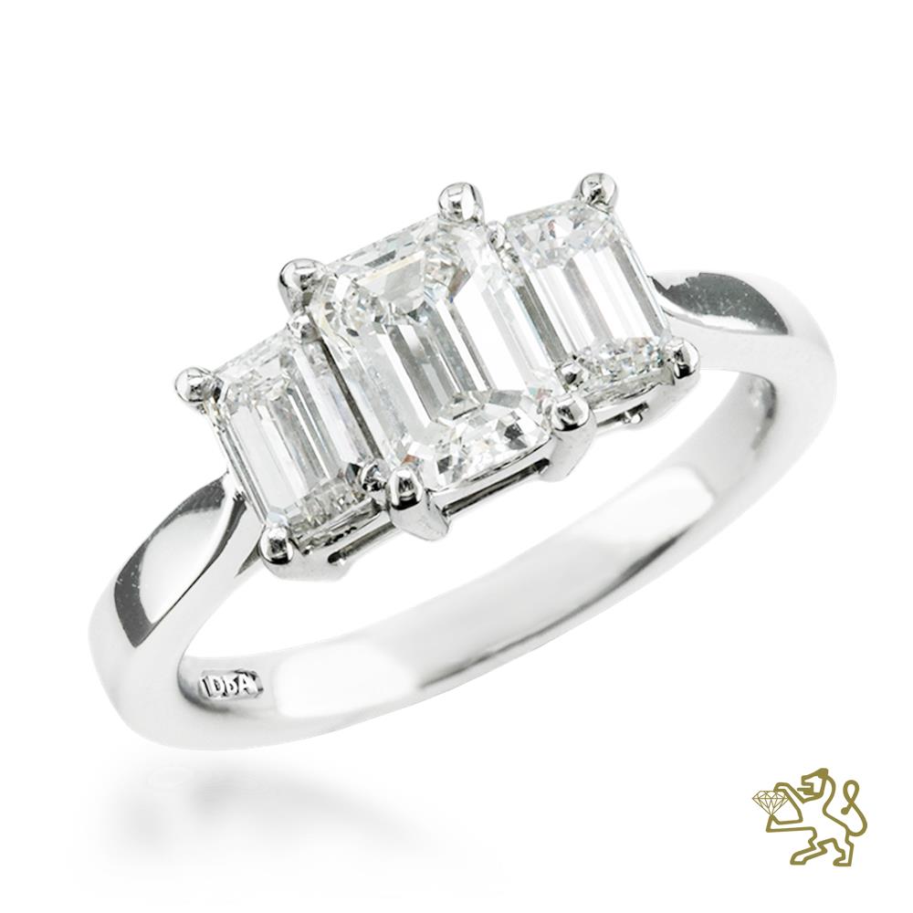 Three graduated emerald cut diamonds sit beautifully together in our Dalkey diamond ring. The size of the central certificated diamond is enhanced by the delicate side stones.The wed-fit profile allows it to sit perfectly against another band without any gapping or need for a shaped band.