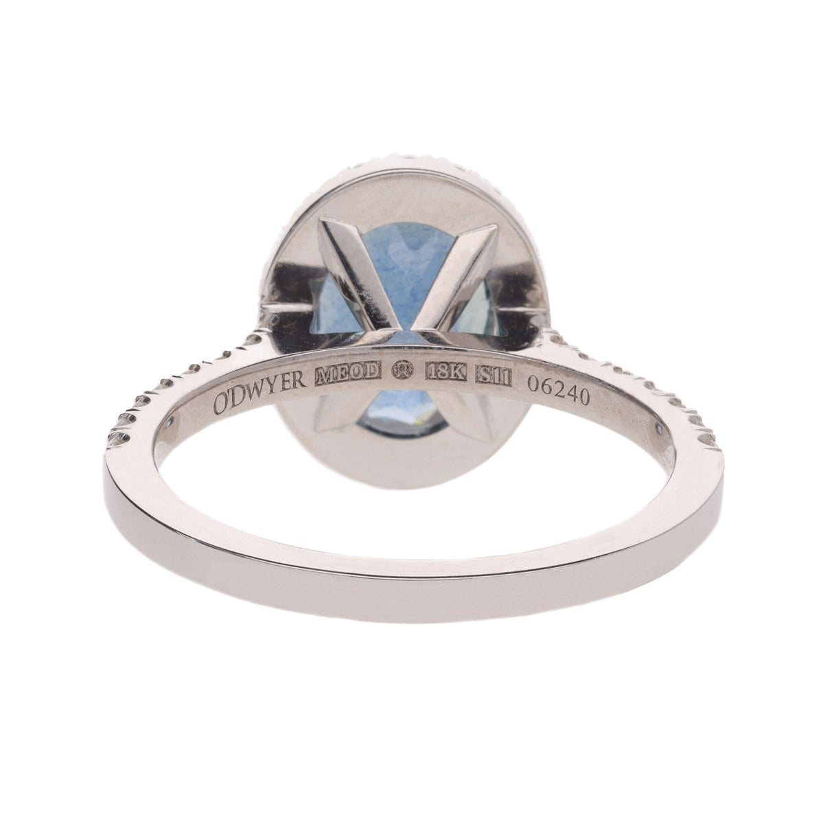 This exquisite ring features an oval malawi sapphire (2.63ct) with a diamond (0.41ct) surround and shoulders, set in 18ct white gold. Ring size: M 1/2.