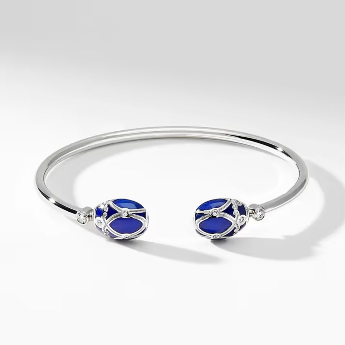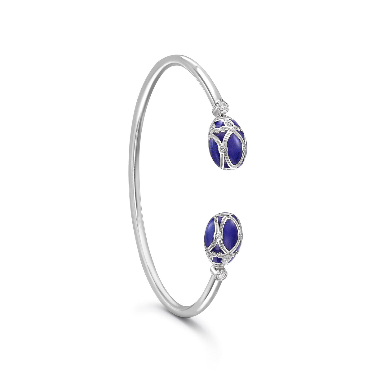The Fabergé Heritage Forever Palais White Gold Royal Blue Guilloché Enamel Open Bracelet is adorned with two royal blue guilloché enamel eggs and 16 brilliant cut round white diamonds. Inspired by the original imperial eggs, this white gold diamond bracelet captures the refinement and technical perfection of Fabergé.