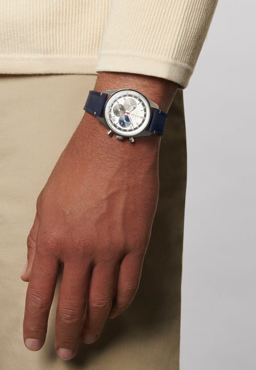 The CHRONOMASTER Original is crafted in a 38mm steel case in the same proportions as the A386, paired with the iconic tri-colour dial and a blue leather strap.