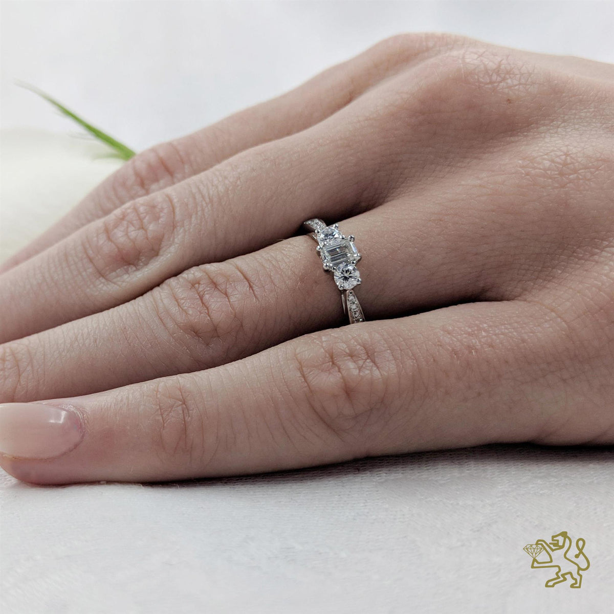 Platinum Three Stone Micro-set diamond shoulders combined with three matching stones perfectly blend the grandeur and brilliance of diamonds to create a wonderfully unique ring.