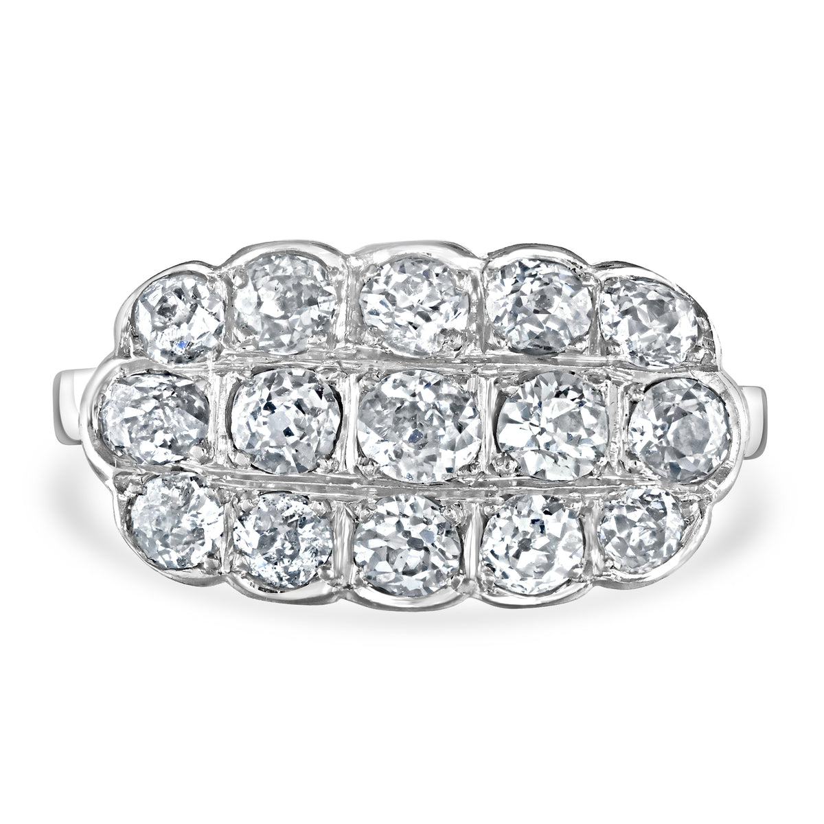 This pre-owned early twentieth century ring features fifteen diamonds set over three rows in a cluster, set in a white metal mount stamped 18k.