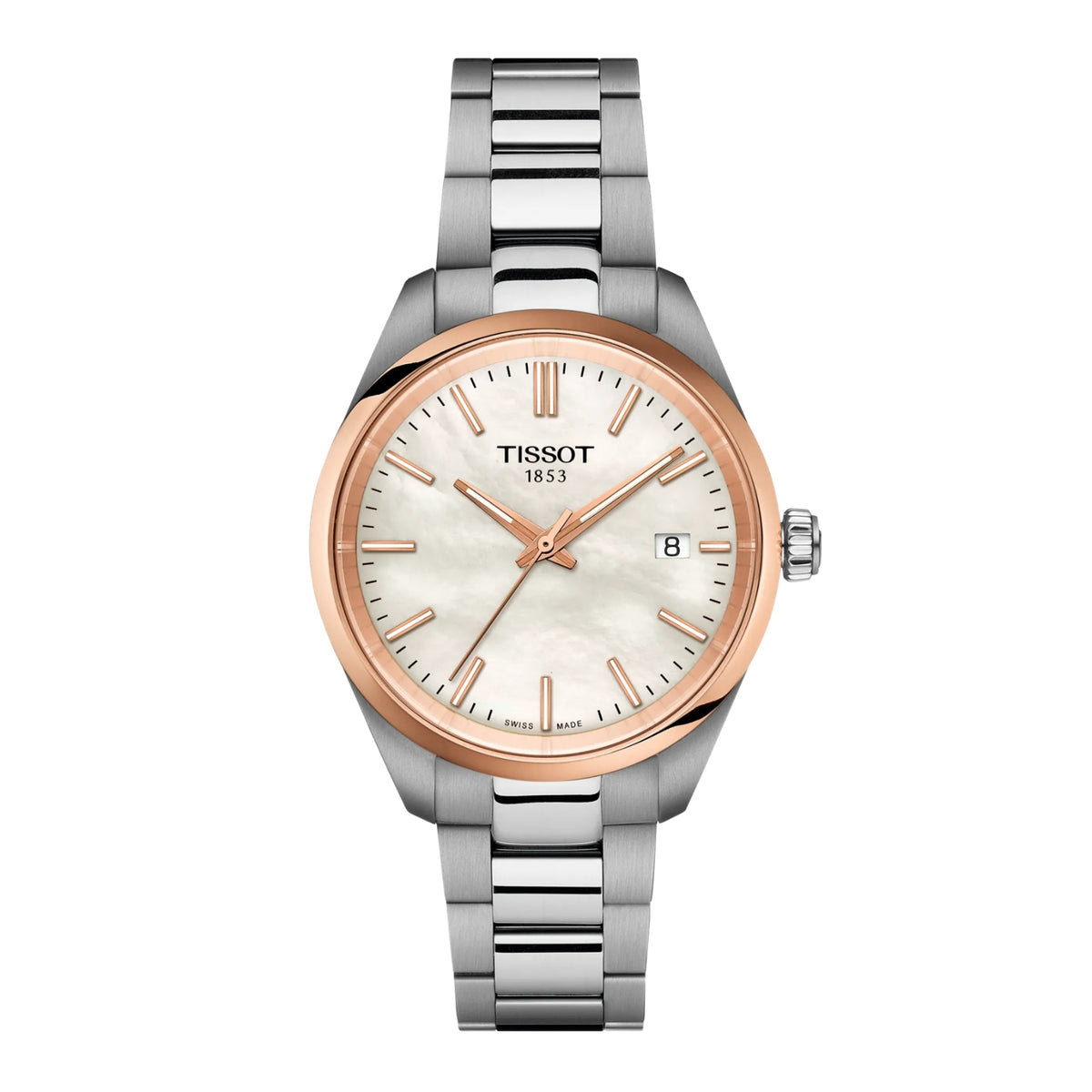 The best-selling Tissot PR 100 remains true to its name: precise (P), robust (R), and water-resistant to a pressure of 10 bar (100 m). This new feminine design offers an elegant and minimalist look. The SuperLuminova®-coated hands enable precise reading even in the dark. This Tissot PR 100 Quartz model features a 34mm stainless steel case with a rose gold PVD bezel, a mother of pearl dial and a classic stainless-steel bracelet for a subtle touch of chic that will make the difference.
